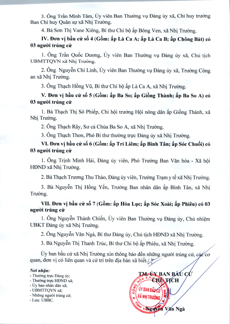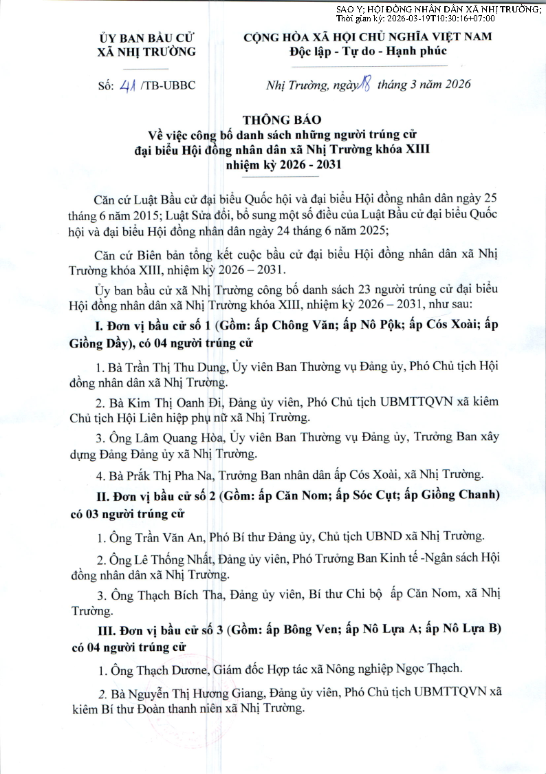 Thông báo số 41/TB-UBBC ngày 18 tháng 03 năm 2026 của Ủy ban bầu cử xã Nhị Trường, thông báo về việc công bố danh sách những người trúng cử đại biểu Hội động nhân dân xã Nhị Trường khóa XIII nhiệm kỳ 2026 - 2031